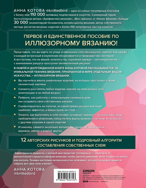 Первое и единственное в мире практическое пособие по иллюзорному вязанию! От самого популярного вязального блогера и автора нескольких бестселлеров — Анны Котовой. Эта книга научит любую вязальщицу, которая освоила основы мастерства, творить настоящую магию на вязаном полотне! Никто не пройдет мимо связанной вами вещи, не оглянувшись, ведь на скромном свитере или джемпере неожиданно, при смене ракурса, проявляется удивительный узор! Недаром эта техника вязания официально признана видом искусства, а работы корифеев демонстрируются в художественных галереях и музеях.