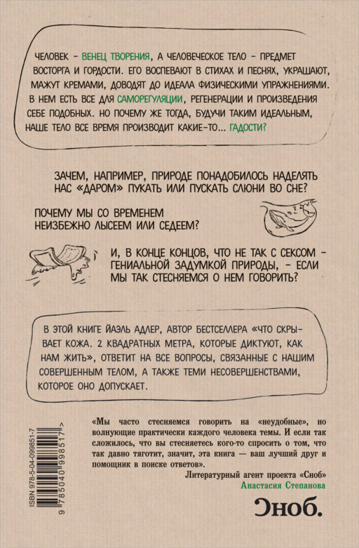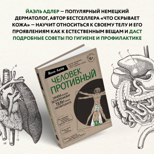 Йаэль Адлер — популярный немецкий дерматолог, автор бестселлера «Что скрывает кожа. 2 квадратных метра, которые диктуют, как нам жить». В своей новой книге она рассказывает о том, почему наше тело, такое совершенное и гениальное по задумке природы, все-таки время от времени издает неприличные звуки, распространяет неприятные запахи и периодически выглядит неопрятно.