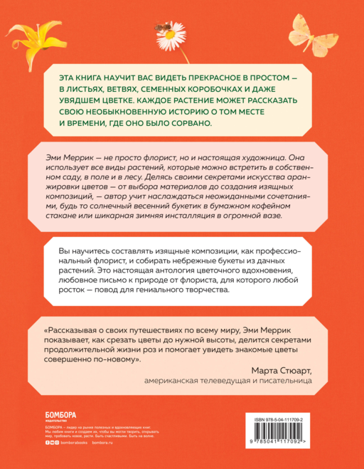 Вдохновляющая книга для начинающих флористов содержит секреты искусства аранжировки цветов: от выбора материалов до создания изящных композиций. Эми Меррик — не просто флорист, но и настоящая художница, которая использует все виды растений, которые можно встретить в собственном саду, в поле и в лесу, чтобы помочь нам увидеть знакомые цветы совершенно по-новому. Она учит наслаждаться неожиданными композициями — будь то солнечный весенний букетик в бумажном кофейном стакане или шикарная зимняя инсталляция в огромной вазе. Вы научитесь видеть прекрасное в простом — в листьях, ветвях, семенных коробочках и даже увядшем цветке, каждый из которых может рассказать свою необыкновенную историю о том месте и времени, в которых они были найдены.