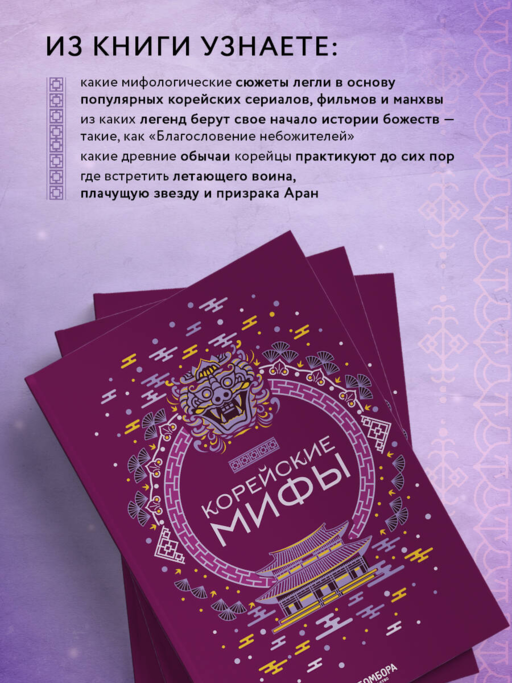 Книга «Корейские мифы» увлечет вас в удивительный мир волшебной, захватывающей Кореи! Вы узнаете, чем уникальна мифология Кореи, а что у нее общего с мифами Японии и Китая. Вы обнаружите, как древние обычаи сохранились и влияют на современную культуру Кореи. Вы познакомитесь с магическими существами и таинственными легендами, ставшими основой таких фильмов и сериалов, как «Поезд в Пусан», «Королевство». В этой книге вас ждут сказки, мифы и легенды, волшебные создания, история Кореи и ее традиций — все, чтобы узнать эту потрясающую страну!