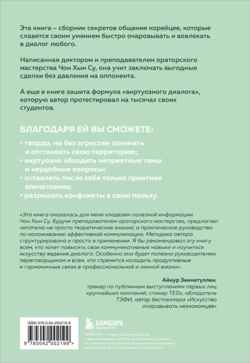 «Эта книга оказалась для меня кладезем полезной информации. Чон Хын Су, будучи преподавателем ораторского мастерства, предлагает читателю не просто теоретические знания, а практическое руководство по налаживанию эффективной коммуникации. Методика автора структурирована и проста в применении. Чон Хын Су пишет доступным и живым языком, что делает чтение легким и приятным. Иногда кажется, что беседуешь с мудрым другом, который делится своими накопленными знаниями и опытом. Я бы рекомендовал эту книгу всем, кто хочет повысить свои коммуникативные навыки и научиться искусству ведения диалога. Особенно она будет полезна руководителям, переговорщикам и всем, кто стремится наладить продуктивные и гармоничные связи в профессиональной и личной жизни». — Айнур Зиннатуллин, тренер по публичным выступлениям первых лиц крупнейших компаний, спикер TEDx, обладатель ТЭФИ, автор бестселлера «Искусство очаровывать незнакомцев»