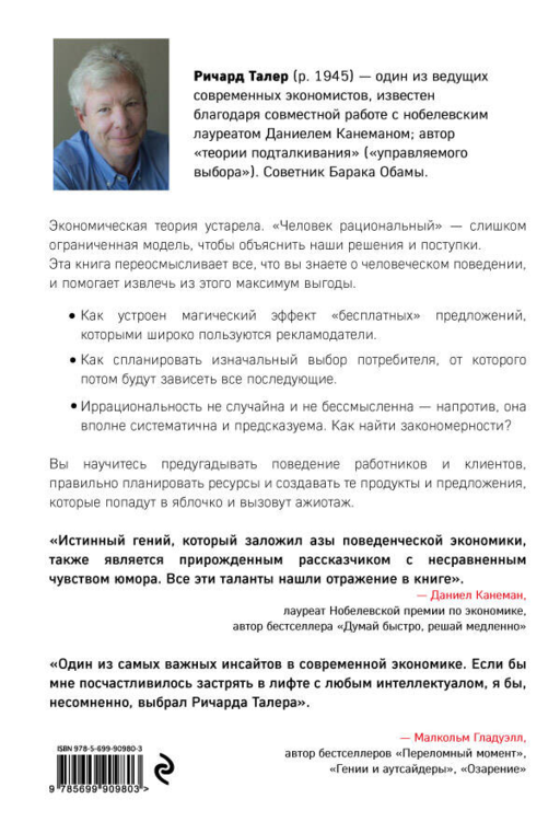 «Новая поведенческая экономика. Почему люди нарушают правила традиционной экономики и как на этом заработать» — ключ к пониманию иррациональных решений и поступков Homo Economicus. Автор книги, лауреат Нобелевской премии по экономике Ричард Талер учит предугадывать нерациональное поведение участников рынков и предсказывать тренды, на которых можно заработать.