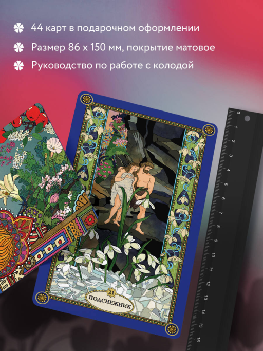 В комплекте красивая подарочная коробка с тиснением фольгой, 44 карт большого размера и цветная брошюра с описанием значений и руководства по их использованию.