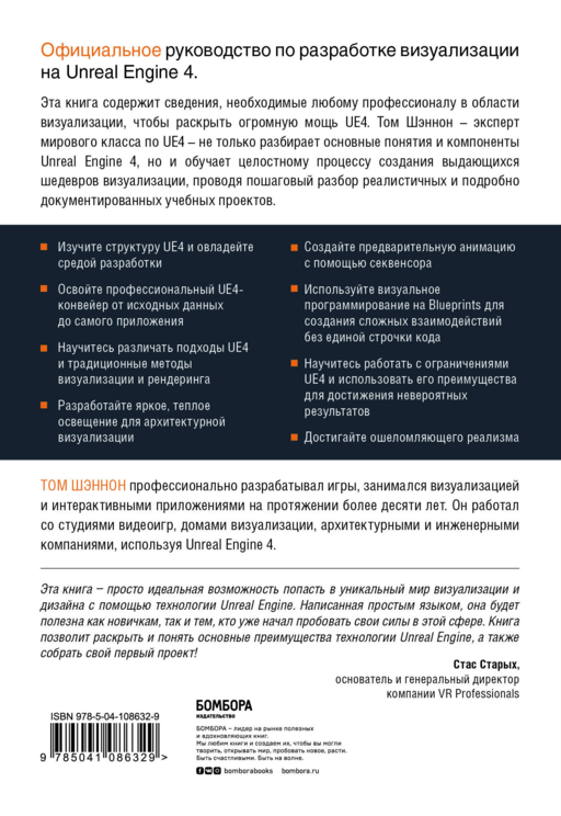 Эта книга содержит знания по использованию огромных возможностей UE4. Эксперт мирового класса по UE4 Том Шеннон отвечает на наиболее часто задаваемые вопросы о визуализации на UE4, решая различные проблемы, от импорта и обработки данных до освещения, дополнительных материалов и рендеринга.