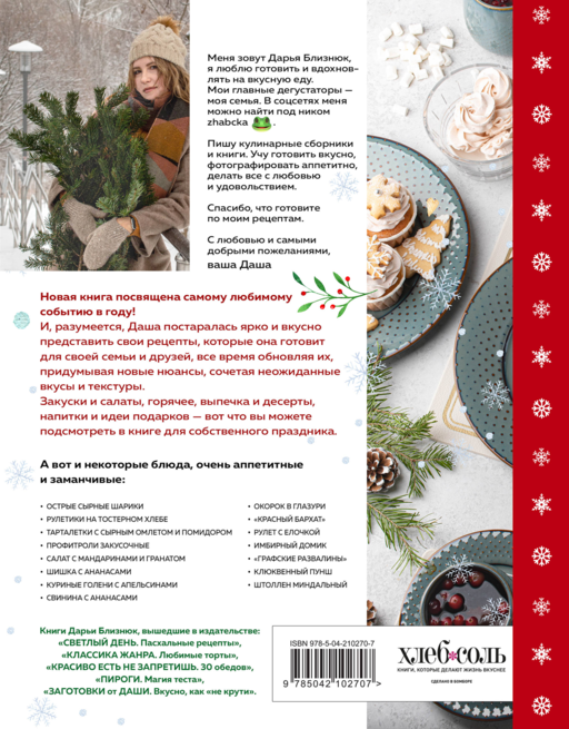 Новое оформление новогодней книги! Дарья Близнюк, известная в социальных сетях как zhabcka, у которой вышло уже пять кулинарных книг, посвятила эту книгу самому любимому событию в году и постаралась ярко и вкусно представить новогодние рецепты, которые она готовит для своей семьи и друзей, все время обновляя их, придумывая новые нюансы, сочетая неожиданные вкусы и текстуры. Рецепты подробно описаны и красочно проиллюстрированы авторскими фото. Закуски и салаты, горячее, выпечка и десерты, напитки и идеи подарков — вот что вы можете подсмотреть в книге для собственного праздника.