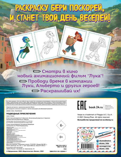 На каждом развороте тебя ждут Лука, Альберто и другие герои нового мультфильма Disney «Лука». Смотри кино и раскрашивай картинки!