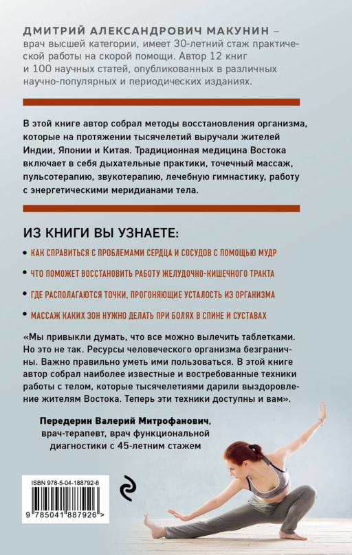 Знаете ли вы, что некоторые звуки, произнесенные на правильном дыхании, способны избавлять тело от боли? Слышали ли когда-нибудь, что пульс человека меняется при заболеваниях внутренних органов? Известно ли вам, что воздействие на точки тела может помочь при серьезных недугах? В новой книге доктора Макунина собраны уникальные восточные техники работы с телом для лечения уже существующих заболеваний и повышения сопротивляемости организма сезонным болезням.