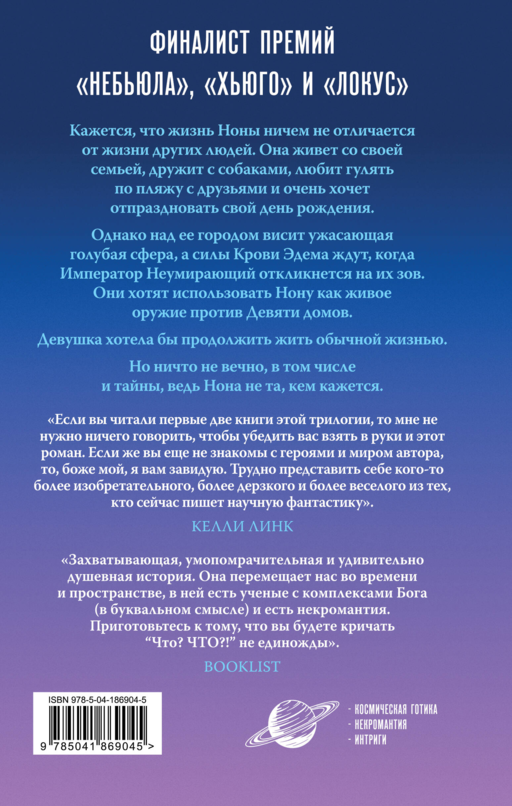 «Захватывающая, умопомрачительная и удивительно душевная история. Она перемещает нас во времени и пространстве, в ней есть ученые с комплексами Бога (в буквальном смысле) и много некромантии. Приготовьтесь к тому, что вы будете кричать “Что? ЧТО?!” ни единожды». — NPR
