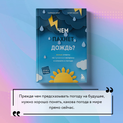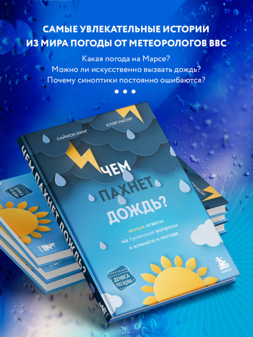 «Мир погоды удивителен и непредсказуем», — говорят метеорологи BBC Саймон Кинг и Клэр Насир. К счастью, кое-что о нем все же удалось узнать. И самые увлекательные истории из мира погоды они собрали в своей книге, которая заинтересует каждого, кто хоть раз удивлялся капризам погоды.