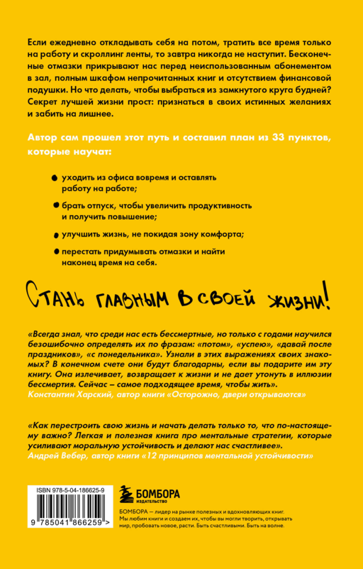 Если ежедневно откладывать себя на потом, тратить все время только на работу и скроллинг ленты, то завтра никогда не наступит. Бесконечные отмазки прикрывают нас перед неиспользованным абонементом в зал, полным шкафом непрочитанных книг и отсутствием финансовой подушки. Но что делать, чтобы выбраться из замкнутого круга будней? Секрет лучшей жизни прост: признаться в своих истинных желаниях и забить на лишнее.