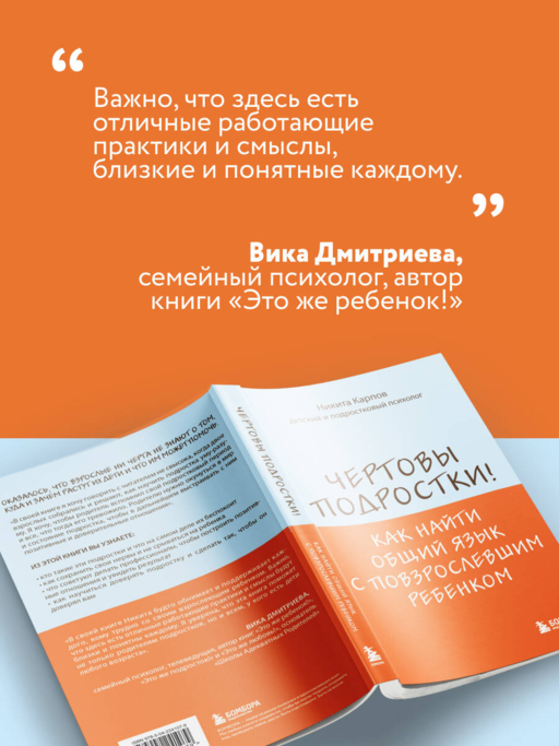 Никита Карпов — детский и подростковый психолог с более чем 20-летним опытом работы. Автор книг «Чертовы подростки!», «Чертовы скандалы!» и «Чертова школа!» с тиражом более 100 000 экземпляров. Ведущий программы «Трудности перехода» на Радио «Маяк». Провел десятки лекций и вебинаров, сотни тренингов и тысячи консультаций. Автор известного телеграм-канала «#Чертовы подростки». Отец двоих детей.