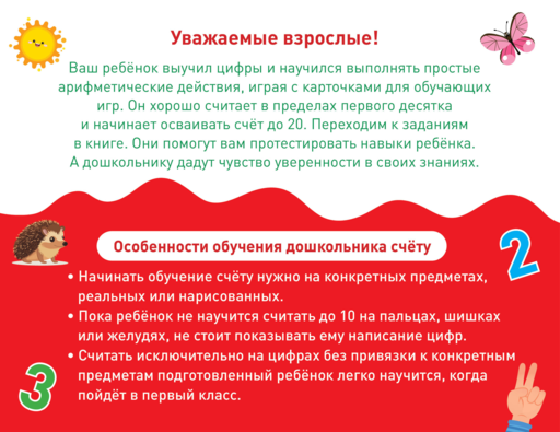 Карточки для развивающих игр — это эффективный инструмент, который поможет ребёнку научиться считать до двадцати, освоить арифметические действия сложения, вычитания, сравнения и сделать первые шаги к пониманию математики. Играть с обучающими карточками очень весело и увлекательно! Они подходят как для занятий дома, так и в детском саду. Набор карточек с цифрами представляет собой 24 картонных листа, каждый из которых ребёнок самостоятельно может разрезать на 6 частей. И у него будет 144 цветные карточки для счета. В наборе есть брошюра-раскладушка с подробными методическими рекомендациями, которые помогут взрослым правильно организовать обучающие игры, и цветная книга с заданиями. Занимаясь по ней, ребёнок сможет закрепить изученный материал. Упражнения из книги можно рассматривать в качестве тестовых заданий для контроля полученных знаний и навыков. Играя с детскими развивающими карточками, рассматривая яркие картинки, дети 3-4-5-6 лет быстро и легко научатся определять количественное наполнение чисел, считать, решать примеры на сложение и вычитание, несложные задачи, разовьют математическое мышление. Карточки прекрасно оформлены и станут отличным подарком мальчикам и девочкам к любому празднику.