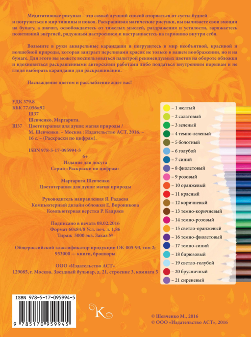 Медитативные рисунки позволят вам освободиться от тяжелых мыслей, раздражения и усталости, зарядят вас позитивной энергией и настроят на гармонию внутри себя. Потрясающие авторские рисунки художницы Маргариты Шевченко погрузят вас в мир необъятной красивой природы, волшебных узоров и цветов. Оторвитесь от суеты будней, расслабьтесь и насладитесь цветом!