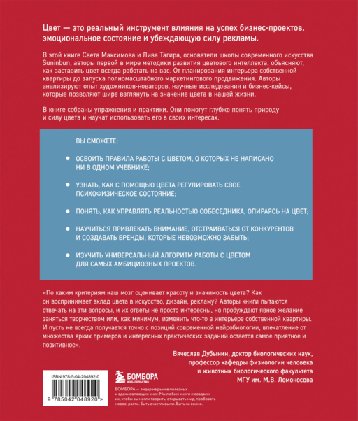 В этой книге Света Максимова и Лива Тагира, основатели школы современного искусства Suninbun, авторы первой в мире методики развития Цветового интеллекта, рассказывают об этом феномене. Авторы анализируют опыт художников-новаторов и научные теории, которые позволяют шире взглянуть на природу цвета.