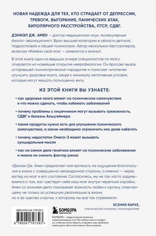 В этой книге один из ведущих в мире специалистов по мозгу и автор бестселлеров доктор Дэниэл Дж. Амен опирается на новейшие открытия нейробиологии. Он бросает вызов устаревшей психиатрической парадигме и помогает читателям улучшить здоровье мозга, сводя к минимуму негативные условия, которые могут мешать полноценно жить.
