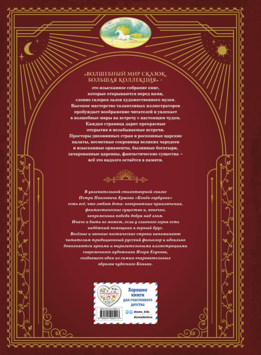 Звонкие, лёгкие, ритмичные строки стихотворной сказки Петра Ершова «Конёк-горбунок» звучат, словно перестук копытцев волшебного конька, и остаются в памяти на долгие-долгие годы после первого прочтения. Необыкновенные приключения простодушного Иванушки и его верного друга конька-горбунка на протяжении многих лет неизменно радуют детей и взрослых. Ведь они, как и должно быть в хорошей, доброй сказке, непременно заканчиваются хорошо! Классический фольклорный сюжет и яркие, насыщенные иллюстрации Игоря Егунова сделают эту книгу прекрасным подарком к любому празднику.