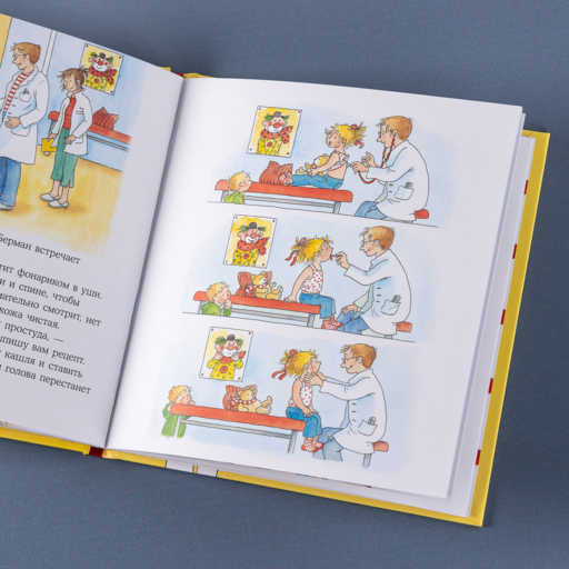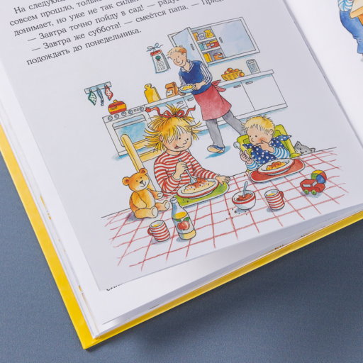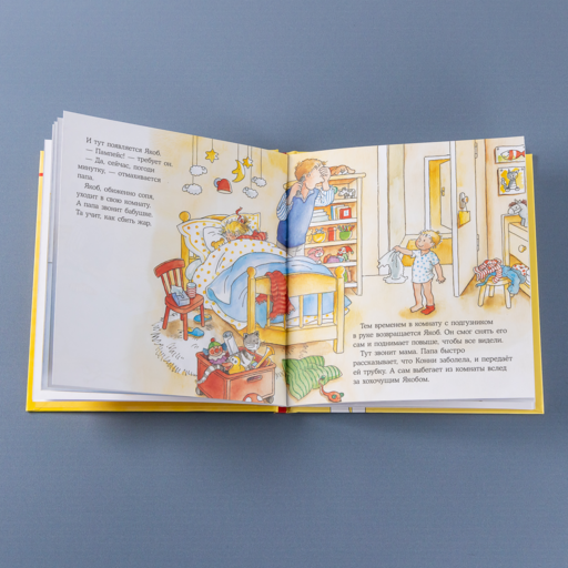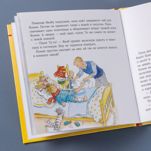 Даже самый крепкий и здоровый малыш время от времени болеет. Вот и у Конни мама уехала в командировку, дома с Конни и Якобом остался один папа, а Конни, как назло, разболелась. Горло саднит, нос заложен и даже поднялась температура. Справится ли папа без мамы? Конечно! Даже соблюдать постельный режим и пить все лекарства, которые выпишет доктор, с ним будет совсем не скучно. И к возвращению мамы у них всё будет хорошо.