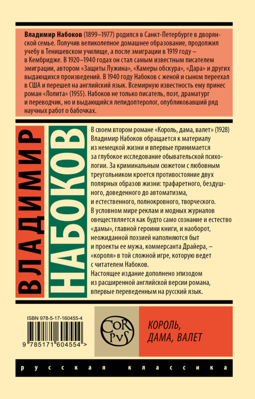 В своем втором романе, вышедшем в Берлине в 1928 году, Набоков отходит от биографичности и ностальгических тонов "Машеньки" и дает волю фантазии. Именно "Король, дама, валет" знаменует рождение писателя Набокова (пишущего пока под псевдонимом В. Сирин), который вскоре покорит сначала Европу, а затем и Америку. Сюжет, словно бы взятый из низкопробного бульварного романа, – лишь прикрытие для изощренной игры с читателем. Герои его – самые обычные, которых можно встретить, например, в вагоне поезда. Там, собственно, читатель с ними и знакомится, словно бы случайно задержав свой взгляд на этой троице. Богатый муж, меркантильная жена и бедный родственник. Естественно, по правилам бульварного любовного романа, оба мужчины влюблены в одну женщину. Сквозь этот банальный любовный треугольник Набоков, как сквозь призму, рассматривает все основные страхи, чаяния, сексуальные комплексы и интеллектуальные устремления человека начала XX века, который на самом деле не слишком отличается от человека начала века XXI.