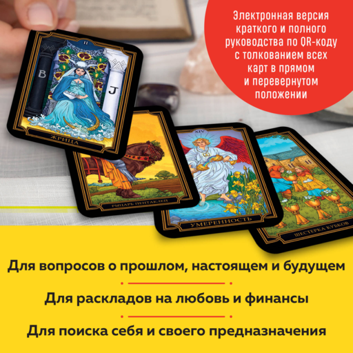 - Электронная версия краткого руководства, доступная по QR-коду, с кратким толкованием Старших и Младших арканов в прямом и перевернутом значении.