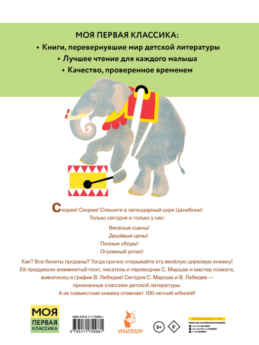 İLK KLASİĞİM: . Çocuk edebiyatının dünyasını değiştiren kitaplar . Her küçük çocuk için en iyi okuma . Zamanla kanıtlanmış kalite Hadi! Hadi! Efsanevi Tsaniboni Sirki'ne koşun! Sadece bugün ve yalnızca bizde: Eğlenceli sahneler! Ucuz fiyatlar! Tam kapasite doluluğu! Büyük başarı! Nasıl? Tüm biletler satıldı mı? O zaman hemen bu neşeli sirk kitabını açın! Onu ünlü şair, yazar ve çevirmen S. Marshak ve afiş ustası, ressam ve grafik sanatçısı V. Lebedev yarattı! Bugün S. Marshak ve V. Lebedev çocuk edebiyatının tanınmış klasikleri olarak kabul ediliyor. Ve onların birlikte hazırladığı kitap 100. yılını kutluyor!