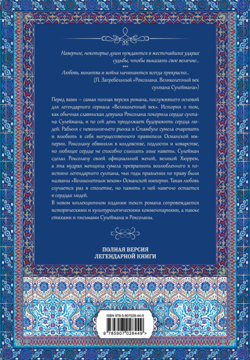 Muhtemelen bazı ruhlar büyüklüklerini göstermek için en ağır kader darbelerine ihtiyaç duyar... *** "Aşk, dua ve savaş her zaman harika başlar…" — P. Zagrebelyi "Hürrem Sultan. Sultan Süleyman'ın Muhteşem Çağı" Karşınızda, efsane dizi "Muhteşem Yüzyıl"ın temelini oluşturan romanın en eksiksiz versiyonu bulunuyor. Sıradan bir Slav kızı olan Hürrem’in, Sultan Süleyman’ın kalbini nasıl fethettiğinin ve hâlâ insanların kalplerini nasıl harekete geçirdiğinin hikayesi. İstanbul köle pazarından gelen bir cariye, Osmanlı İmparatorluğu'nun güçlü hükümdarını büyüleyip aşık etmeyi başardı. Hürrem’e büyücülük, hainlik ve aldatmaca suçlamaları yöneltildi, ancak sevgi dolu kalp kötü iftiraları duymaz. Süleyman, Hürrem'i resmen eşi ve büyük Hürrem yaptı ve bu bilge kadın, sevgilisini "Muhteşem Yüzyıl" olarak adlandırılan efsanevi sultana dönüştürdü. Böyle bir aşk yüzyılda bir kez yaşanır, ancak hatırası insan kalplerinde sonsuza dek yaşar. Yeni koleksiyon baskısında, romanın metni tarihsel ve kültürel yorumlar, ayrıca Süleyman ve Hürrem’in şiirleri ve mektuplarıyla desteklenmiştir.