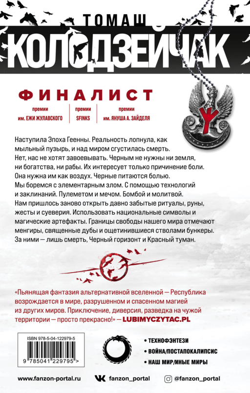 Gehenna Çağı başladı. Gerçeklik, bir sabun köpüğü gibi patladı ve dünya üzerinde ölüm karardı. Hayır, bizi fethetmek istemiyorlar. Kara'ların ne toprağa ne zenginliklere ne de kölelere ihtiyacı var. Tek ilgilendikleri acı vermek. Onlar için hava kadar gerekli. Kara'lar acı ile beslenir. Biz ise temel kötülüğe karşı savaşıyoruz. Teknoloji ve büyülerle. Makineli tüfek ve kılıçla. Bomba ve dua ile. Uzun zaman önce unutulmuş ritüelleri, yazıtları, jestleri ve batıl inançları yeniden keşfetmek zorunda kaldık. Ulusal sembolleri ve büyülü eşyaları kullandık. Dünyamızın özgürlük sınırlarını menhirler, kutsal meşeler ve diken diken olmuş sığınaklar işaretliyor. Arkalarında sadece ölüm, Kara Ufuk ve Kızıl Sis var. Jerzy Żuławski Ödülü, Janusz A. Zajdel Ödülü, SFinks Ödülü finalistidir. «Alternatif evrenin büyüleyici fantezisi — Cumhuriyet, diğer dünyalardan gelen büyü ile yıkılmış ve kurtarılmış bir dünyada yeniden doğuyor. Macera, sabotaj, yabancı topraklarda keşif — harika!» — lubimyczytac.pl