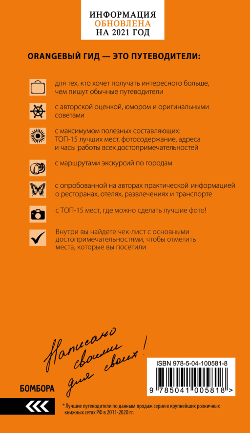Karadağ hakkında yepyeni bir rehber, parlak kapaklı en çeşitli ve popüler "Turuncu Rehber" serisinden. İçinde Karadağ şehirlerinde nerelere gidileceği ve nasıl vakit geçirileceğiyle ilgili yazarın faydalı tavsiyeleri ve çok daha fazla renkli fotoğraf bulunuyor. Ayrıca kitabın kenarlarında yürüyüş noktaları arasındaki kesin mesafeler ve kullanışlı bir katlanabilir harita yer almakta. 2021'in yeniliği - gezilecek yerleri işaretleyebileceğiniz bir kontrol listesi!