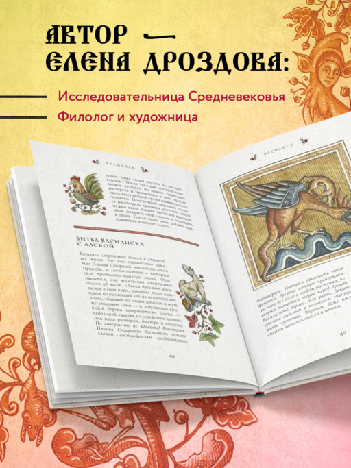 Ortaçağ canavar kitapları, bizim alışık olduğumuz anlamda bilimsel traktatlar değillerdi — çevremizdeki dünyaya dair bilgileri toplamak ve sistematize etmek amacıyla oluşturulmuş bir tür ansiklopedi gibiydiler. Latince'den bestia "canavar" anlamına gelir, ancak bu tür kitaplarda kuşlar, balıklar, böcekler, bitkiler ve hatta mineraller hakkında tanımlamalar bulunabilirdi. Hayvanlarla ilgili hikayeler, dinsel anlamlar taşıyan fabllar ve şiirlerle süslenebiliyordu, çünkü o dönemde insanlar tüm canlı dünyasının ilahi Güç ve Söz'ün bir yansıması olduğuna inanırlardı. Yeni Ortaçağ Canavar Kitabı, farklı dünyalardan gelen bilgileri bir araya getirir. Bu, hayvanlar hakkında eski çağlardan günümüze kadar oluşmuş geniş bir anlayış yelpazesi sunar. Kitap hazırlanırken, hayvanların davranışlarını ve yaşadıkları çevreyi yüksek doğrulukla anlatan antik yazarların eserleri kullanılmıştır. Ayrıca Ortaçağ'ın mitleri ve efsaneleri de derlenmiştir. Kitabın yazarı Elena Drozdova, filolog ve sanatçı, Ortaçağ dönemi araştırmacısıdır. Tüm illüstrasyonlar 12-14. yüzyıl Ortaçağ el yazması stilindedir.