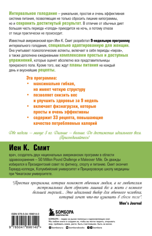 Birçok aralıklı oruç kitabı, okuyuculara "beslenme penceresi" sırasında ne ve ne kadar yemeleri gerektiğine, hatta her gün ne kadar süreyle aç kalmaları gerektiğine kendilerinin karar vermesini önerir. Smith, kilo vermek ve sağlığını iyileştirmek isteyen yüksek motivasyona sahip insanların bile somut talimatlara ihtiyacı olduğunu bilir. İşte bu talimatlar Fast Burn! 9 haftalık programına dahil edilmiştir. Doktor Ian, program katılımcılarının tutkularının esiri olmamalarını sağlamak için menüyü çeşitlendiren ve yeni tat deneyimleri sunan iki pozitif yıkıcı Puzzle haftası tasarladı. Yazarın programı sadece günlük beslenme planıyla sınırlı değildir. Her hafta için detaylı şekilde hem spor salonunda hem de dışında basit ve ulaşılabilir egzersizler içerir. Fiziksel aktiviteler erişilebilir, kolay ve son derece etkilidir. Ek olarak, kalori kalitesini artırmaya yönelik 33 tarif ve programın üç aşamasında kullanılabilen "Yağ Yakıcı" smoothie tarifi sunulmaktadır. İki haftada 5 kg kayıp. Sonrası daha fazlası. İdeal kiloya ulaşana kadar. Katılın!