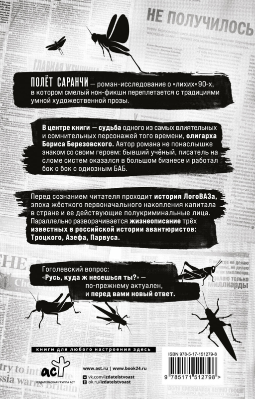 "Çekirge Uçuşu", cesur bir kurgu-dışı anlatının akıllı edebi geleneğiyle iç içe geçtiği, 'kötü' 90'ların bir roman-araştırmasıdır. Kitabın merkezinde, o dönemin en etkili ve tartışmalı figürlerinden oligark Boris Berezovski'nin kaderi yer almaktadır. Romanın yazarı, kahramanını yakından tanımaktadır: eski bir bilim insanı ve sistemin çöküşünde bir yazar, büyük iş dünyasında yer almış ve tartışmalı Boris Abramoviç Berezovski ile yan yana çalışmıştır. Okuyucunun bilincinde Logovaz hikayesi geçerken, ülkede sert ilk sermaye birikimi dönemi ve yarı mafya yüzleri canlanır. Paralel olarak, Rusya tarihindeki üç tanınmış maceraperestin: Troçki, Azev, Parvus'un biyografileri gelişir. Gogol'ün sorusu: "Rusya, nereye koşuyorsun?" hâlâ günceldir ve karşınızda yeni bir cevap vardır.