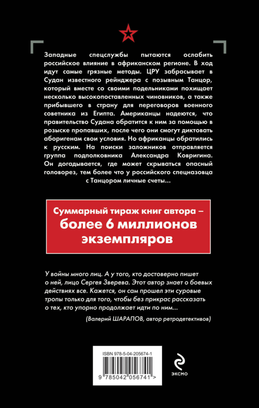 Yazarın toplam kitap tirajı 6 milyondan fazladır. Batılı istihbarat servisleri, Afrika bölgesindeki Rus etkisini zayıflatmaya çalışıyor. En kirli yöntemler kullanılıyor. CIA, Tanztar kod adlı ünlü bir izciyi Sudan'a gönderiyor. O ve ekibi, birkaç üst düzey yetkiliyi ve müzakereler için gelen Mısır askeri danışmanını kaçırıyor. Amerikalılar, Sudan yönetiminin fidye aramak için kendilerinden yardım isteyeceğini ve böylece yerlilere şartlarını dayatabileceklerini umuyor. Ancak Afrikalılar Ruslara başvuruyor. Rehine kurtarma için albay Aleksandr Kovrigin liderliğinde bir ekip gönderiliyor. Kovrigin, tehlikeli katilin nerede olabileceğini tahmin ediyor, hele Rus özel kuvvetleri ile Tanztar arasında kişisel bir hesaplaşma var... Gerçek kahramanlar ve gerçek koşullar, gerçek okurlar için. Dağ geçitleri, pusular ve acımasız çete çatışmaları — bu patlayıcı atmosfer bu sürükleyici aksiyon romanlarının özüdür. “Savaşın birçok yüzü var. Ve onu doğru şekilde anlatanın yüzü Sergey Zverev'dir. Bu yazar, savaş hakkında her şeyi bilir. Görünüşe göre o sert yolları çok zor deneyimlemek için kendisi geçti ve onları olduğu gibi anlatmak istedi...” — Valeriy Sharapov, retro dedektif roman yazarı