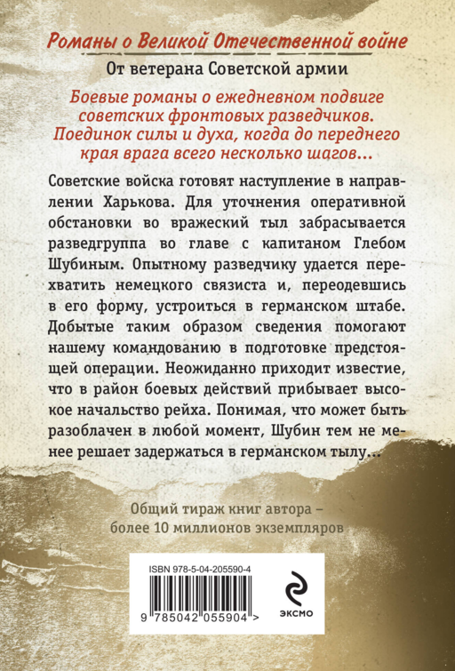 Sovyet ön cephe istihbaratçılarının günlük kahramanlıkları üzerine savaş romanları. Düşmanın ön hattına sadece birkaç adım kala güç ve ruhun mücadelesi. Olaylar, askerler bile anlatmaya cesaret edemediği acımasız savaş detayları. Sovyet birlikleri Harkov yönünde taarruz hazırlığında. Operasyonel durumu netleştirmek için kaptan Gleb Shubin liderliğinde bir keşif grubu düşman hattına sızdırılır. Tecrübeli bir istihbaratçı, Alman telsiz operatörünü ele geçirip onun üniformasını giyerek Alman karargahına sızmayı başarır. Böyle elde edilen bilgiler, komutanlığımıza yaklaşan operasyonda yardımcı olur. Aniden, bölgeye yüksek rütbeli almanca yetkililerin geldiği haberi gelir. Her an ortaya çıkma riski altında olan Shubin yine de Alman gerisinde kalmaya karar verir... Yazarın kitaplarının toplam tirajı 10 milyondan fazladır.