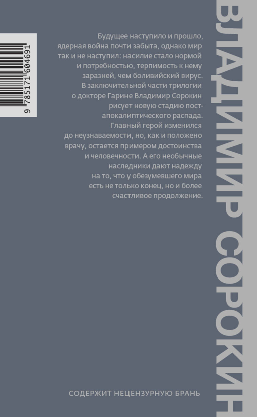 Владимир Сорокин, автор нашумевших романов “Голубое сало” и “Норма”, в финальной части трилогии о докторе Гарине показывает постапокалиптический мир будущего, израненный последствиями ядерной войны. Последствия катастрофы до сих пор не изжиты, и мир становится лишь далекой фантазией, недостижимой из-за всепоглощающего насилия и хаоса. И все же чудесный доктор, изменившийся до неузнаваемости, остается неоспоримым примером достоинства и человечности даже среди всеобщего разложения и отчаяния.