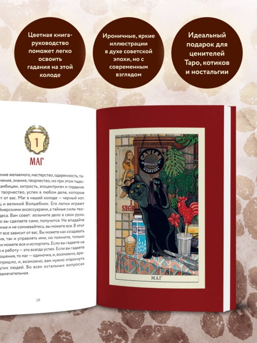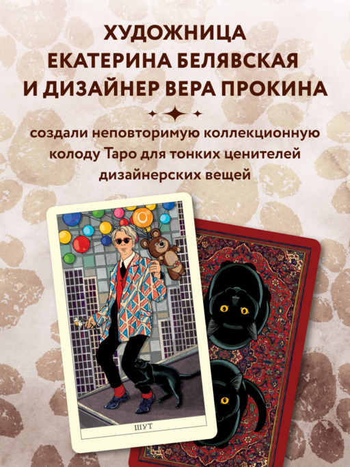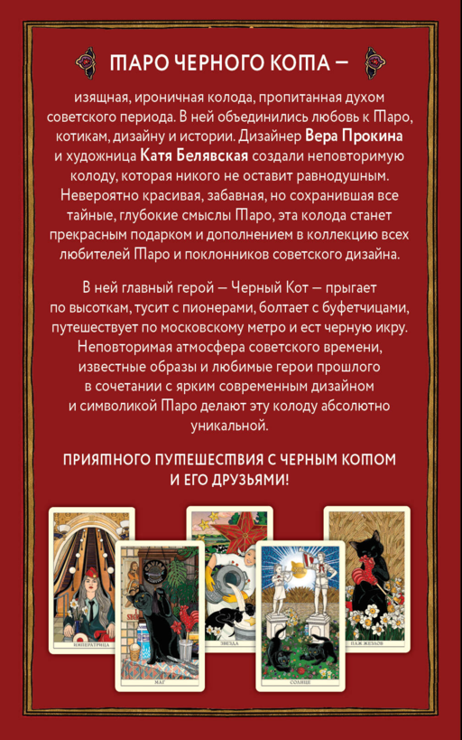 Абсолютное очарование для ценителей изящных коллекционных колод Таро. Очень стильная, яркая, ироничная колода, вдохновленная советским дизайном. В ней сочетается любовь к котикам, дизайну, истории и Таро. Художница Екатерина Белявская и дизайнер Вера Прокина создали неповторимую коллекционную колоду Таро для тонких ценителей дизайнерских вещей. Главный герой колоды — легендарный Черный кот, который тусит с пионерами, болтает с буфетчицами, ест черную икру и путешествует по московскому метро. Неповторимая атмосфера, ирония, великолепные иллюстрации в сочетании с символикой Таро Уэйта делает эту колоду уникальной. Колода «Таро Черного кота» — замечательный подарок: в комплект входит большая магнитная коробка, яркие плотные карты с фольгированным обрезом, цветная книга с руководством по гаданию.