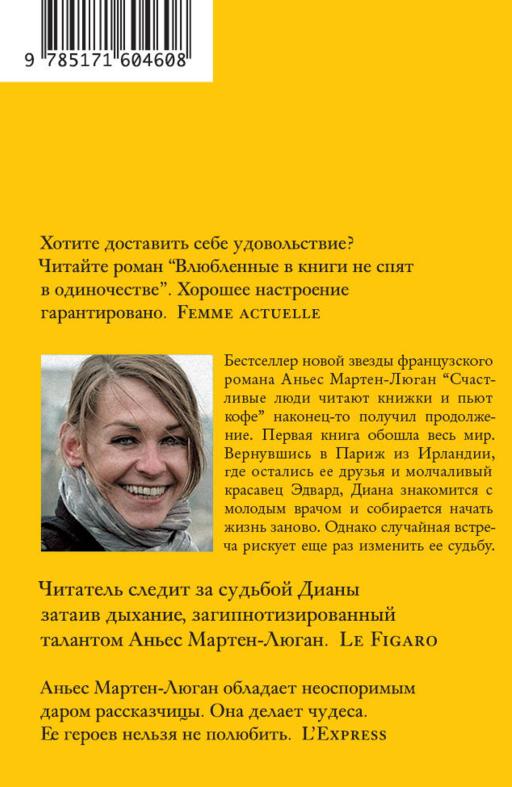 «Мы поломанные, истерзанные люди, сумели создать счастливую семью, и нам было хорошо…» Та сила, с которой Диану манит Ирландия, ощущается на каждой странице. Ни красота Парижа, ни родное сердцу кафе, ни желание быть хоть как-то ближе к любимым Колену и Кларе не способны эту тягу преодолеть – Диана снова летит в объятия пронзительного ветра, бушующего моря и… Нет, в это невозможно поверить. Сомнения отступят только в самый последний момент. «Читатель следит за судьбой Дианы, затаив дыхание, загипнотизированный талантом Аньес Мартен-Люган» Le Figaro. Самый первый роман французской писательницы Аньес Мартен-Люган – «Счастливые люди читают книжки и пьют кофе» – был прекрасно принят восторженной публикой и переведен на 40 языков. В 2015 году права на его экранизацию были выкуплены голливудскими продюсерами.