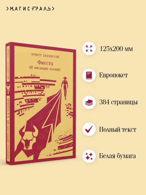 В своем первом романе «Фиеста (И восходит солнце)» Хемингуэй освещает проблемы и боль потерянного поколения, переплетая любовь и потери после Первой мировой войны. История рассказывает об эмигрантах, живущих в Париже 1920-х годов: Джейке Барнсе — ветеране и журналисте и Бретт Эшли — англичанке, светской львице. Вместе с героями мы путешествуем от бурной ночной жизни Парижа до безжалостных арен корриды Испании, погружаясь в атмосферу духовного разложения общества, морального банкротства и призрачных иллюзий.