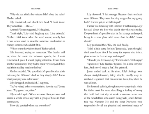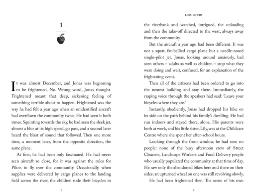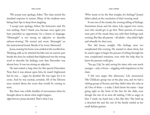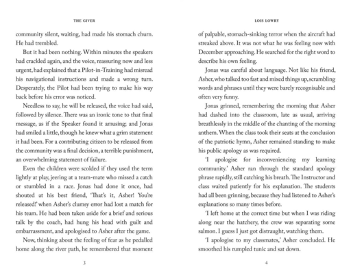 Life in the community where Jonas lives is idyllic. Designated birthmothers produce newchildren, who are assigned to appropriate family units. Citizens are assigned their partners and their jobs. No one thinks to ask questions. Everyone obeys. Everyone is the same. Except Jonas.