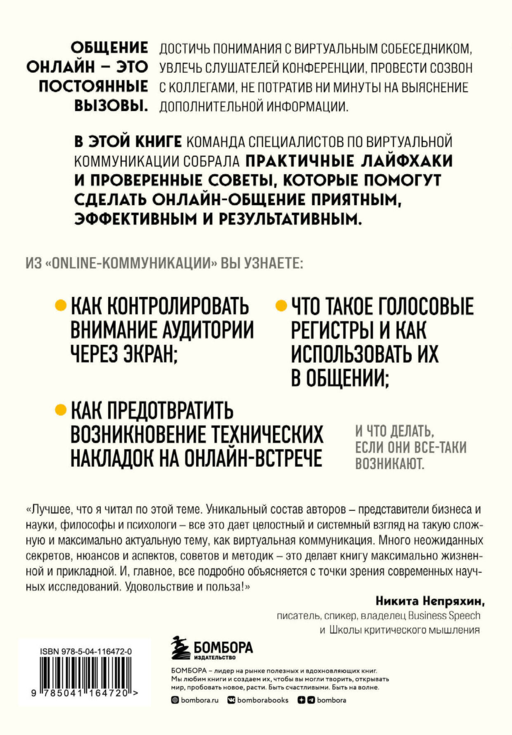 «Лучшее, что я читал по этой теме. Уникальный состав авторов — представители бизнеса и науки, философы и психологи — все это дает целостный и системный взгляд на такую сложную и максимально актуальную тему, как виртуальная коммуникация. Много неожиданных секретов, нюансов и аспектов, советов и методик — это делает книгу максимально жизненной и прикладной. И, главное, все подробно объясняется с точки зрения современных научных исследований. Удовольствие и польза!» — Никита Непряхин, писатель, спикер, владелец Business Speech и Школы критического мышления
