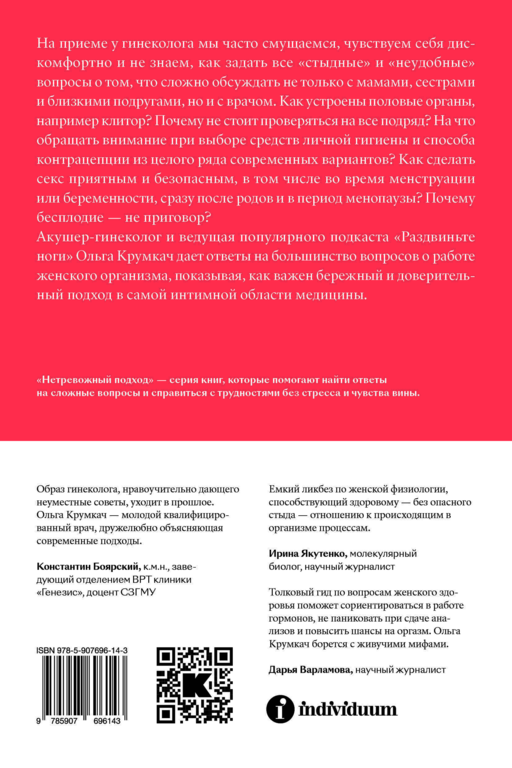 Как устроены половые органы, например клитор? Почему не стоит проверяться на все подряд? На что обращать внимание при выборе средств личной гигиены и способа контрацепции из целого ряда современных вариантов? Как сделать секс приятным и безопасным, в том числе во время менструации или беременности, сразу после родов и в период менопаузы? Почему бесплодие — не приговор? Акушер-гинеколог Ольга Крумкач дает ответы на большинство вопросов о работе женского организма, показывая, как важен бережный и доверительный подход в самой интимной области медицины.