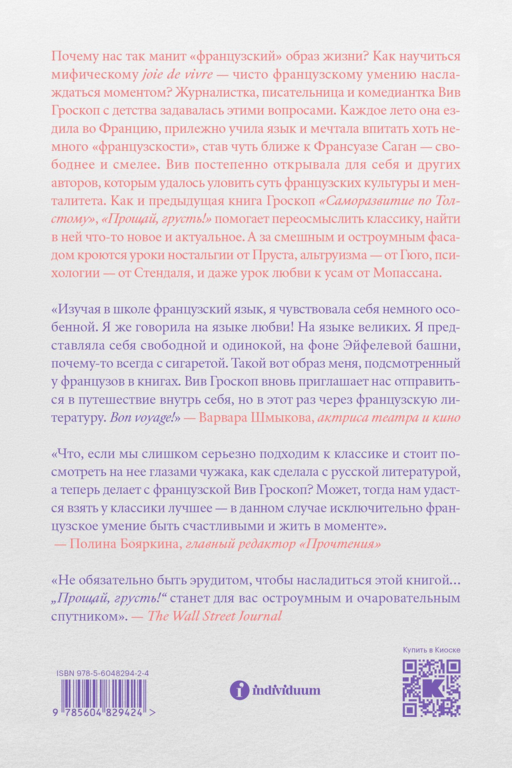 Почему нас так манит «французский» образ жизни? Как научиться мифическому joie de vivre — чисто французскому умению наслаждаться моментом? Журналистка, писательница и комедиантка Вив Гроскоп с детства задавалась этими вопросами. Каждое лето она ездила во Францию, прилежно учила язык и мечтала впитать хоть немного «французскости», став чуть ближе к Франсуазе Саган — свободнее и смелее. Вив постепенно открывала для себя и других авторов, которым удалось уловить суть французских культуры и менталитета. Как и предыдущая книга Гроскоп «Саморазвитие по Толстому», «Прощай, грусть!» помогает переосмыслить классику, найти в ней что‑то новое и актуальное. А за смешным и остроумным фасадом кроются уроки ностальгии от Пруста, альтруизма — от Гюго, психологии — от Стендаля, и даже урок любви к усам от Мопассана.