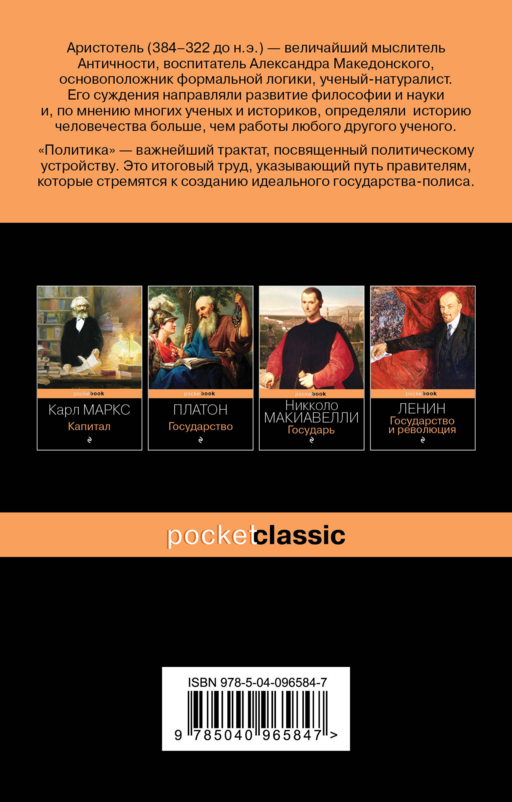 Аристотель — величайший древнегреческий философ, ученик Платона и учитель Александра Македонского. Главное место среди его трудов, посвященных государству и обществу, занимает «Политика» — один из важнейших текстов античной философии. В нем дан глубокий и подробный анализ общественного и государственного устройства Древней Греции. Аристотель рассматривает конституцию и законодательство, причины государственных переворотов, говорит об идеальном государстве и общественном воспитании.