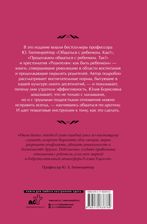 В это издание вошли бестселлеры профессора Ю. Б. Гиппенрейтер "Общаться с ребенком. Как?", "Продолжаем общаться с ребенком. Так?" и хрестоматия "Родителям: как быть ребенком" - книги, совершившие революцию в области воспитания и продолжающие окрылять родителей. Автор подробно рассматривает воспитательные нормы, бытующие в нашей культуре много десятилетий, - и показывает, почему они утратили эффективность. Юлия Борисовна доказывает, что не только с малышами, но и с трудными подростками отношения можно исправить всегда, - научившись общаться по-другому. И дает пошаговые инструкции к тому, как это сделать.