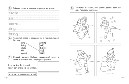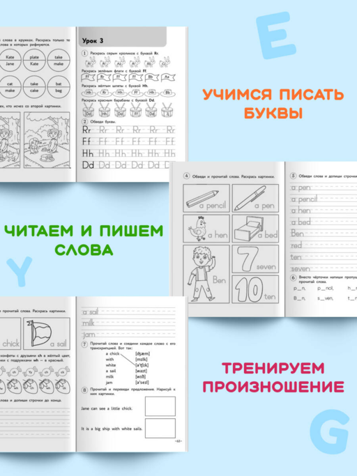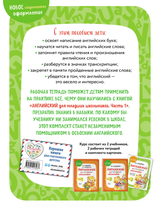С «Английским для младших школьников» ваш ребенок познакомится с английскими буквами и звуками, разберется в их произношении, освоит правила чтения английского языка, запомнит множество полезных слов, научится строить простые предложения и овладеет основами грамматики. Рабочая тетрадь к пособию «Английский для младших школьников. Часть 1» — это возможность потренироваться в написании и использовании слов и букв, усвоить их произношение и научиться понимать значки транскрипции. По какому бы учебнику ни занимался ваш школьник, базовые знания по английскому языку помогут ему успешнее справляться с заданиями и лучше понимать материал на уроках. А главное — он приобретет реальные знания, которые непременно помогут получать отличные оценки и чувствовать себя уверенно и на уроках, и в путешествиях!