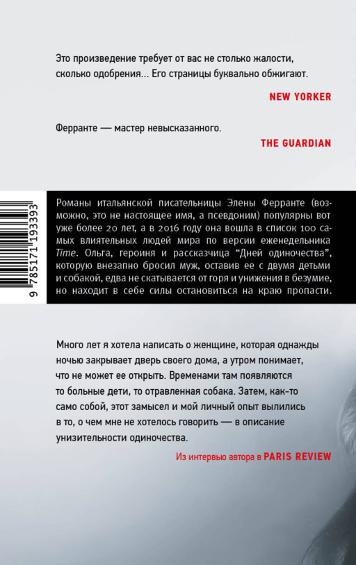Ольга, главная героиня романа, внезапно стала разведенной женщиной сильно за тридцать, с двумя детьми и собакой. Муж после пятнадцати лет брака просто заявил во время обеда, что между ними всё кончено, попросил винить во всем его и тихо закрыл за собой дверь. Что теперь делать? Как начать жизнь заново? И возможно ли это сделать? Романы Элены Ферранте были переведены на 40 языков, а еженедельник Time в 2016 году включил писательницу в список 100 самых влиятельных людей мира. И при этом факты ее биографии скрыты и от читателей, и от критиков: никто не знает, пишет ли она под собственным именем или пользуется псевдонимом. Ферранте считает, что литературному произведению не нужна связь с его создателем, реальным человеком, чью фотографию обычно помещают на обратную сторону обложки. Роман таинственной итальянки абсолютно точно может постоять за себя сам, без всяких фотографий. Эта плотная, напряженная проза, наполненная необычайно точными психологическими наблюдениями, драматичными поворотами и тонким юмором завораживает буквально с первых же страниц.