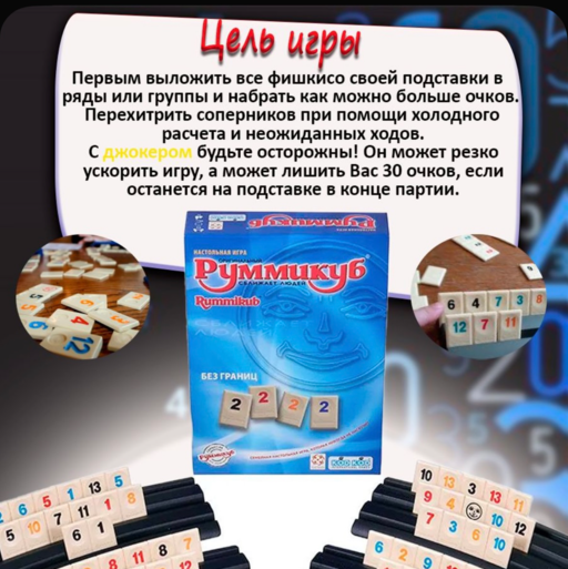 Настольная игра Руммикуб торговой марки Jia Yi Toys это компактная версия оригинальной игры. Руммикуб в его гениальной простоте подарит вам бесконечно увлекательный досуг, ведь каждая игра будет разной, как и комбинации выложенных фишек! Цель игры: первым выложить все фишки со своей подставки в ряды или группы и набрать как можно больше очков. Перехитрить соперников при помощи холодного расчёта и неожиданных ходов! С джокером будьте осторожны. Он может резко ускорить игру, а может лишить вас 30 очков, если останется на подставке в конце партии! По Руммикубу даже устраивают целые турниры, которые и сейчас популярны! А вы можите устроить свой такой турнир! Играть можно быстро и легко, а можно обдуманно и долго, раскрывая свои стратегические способности! Игра Руммикуб послужит отличным семейным подарком! Игра отвлечёт от суеты и доставит удовольствие! Настольная игра это отличное средство досуга, проводите весело время с друзьями или семьей. Настольные игры не только позволяют весело провести время, но и развивают стратегическое мышление у людей, играть можно и взрослым и детям. Настольная игра это прекрасный подарок друзьям или родственникам.