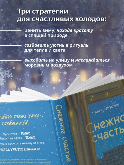 «Снежное счастье» — не просто книга о том, как полюбить зиму. Это обширное исследование психологии мышления и менталитета. Внутри вы найдете стратегии и практические рекомендации, которые помогут сменить внутреннюю оптику, чтобы научиться находить смысл, радость и устойчивость даже в периоды холода и тьмы — как во внешнем мире, так и внутри себя.