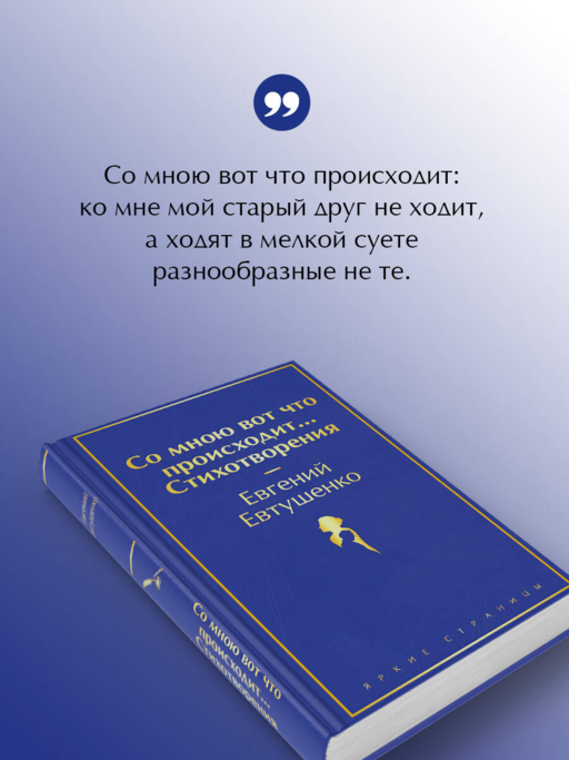 Евгений Евтушенко — признанный мастер русского стиха, страстный, наблюдательный, острый поэт, чья лирика полюбилась миллионам читателей со всего света. Неслучайно уже много десятилетий люди читают его знаменитые поэмы, стихотворения «Людей неинтересных в мире нет...», «Со мною вот что происходит...», «Окно выходит в белые деревья...» и множество других. Каждый любитель поэзии найдёт в многогранном таланте Евтушенко что-то своё: острый и современный взгляд на действительность, критический накал, пожары любовных переживаний и философскую глубину мысли.