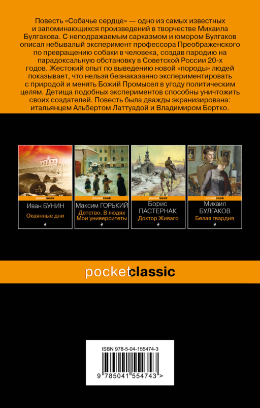 «Собачье сердце» — одно их самых известных и запоминающихся произведений Михаила Булгакова. С неподражаемым сарказмом и юмором Булгаков описал небывалый рискованный эксперимент профессора Преображенского по превращению собаки в человека, создав великолепную пародию на парадоксальную обстановку Советской России 30-х годов. Жестокий опыт по выведению новой «породы» людей показывает, что нельзя безнаказанно экспериментировать с природой и менять Божий Промысел в угоду политическим целям. Детища подобных экспериментов способны уничтожить своих создателей.