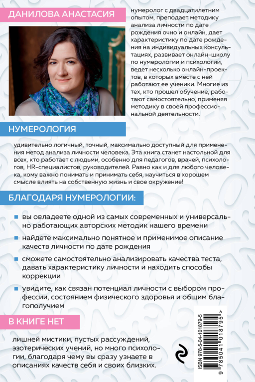 Анастасия Данилова более 20 лет своей жизни занимается нумерологией: ведет семинары, обучает этому методу, консультирует людей по дате рождения, дает характеристику личности, раскрывает совместимость в отношениях, подсказывает возможную коррекцию качеств. Автор продолжает развиваться в нумерологии, менять с помощью цифр свою жизнь, находить ответы на вопросы о себе самой, об окружающих людях, о реализации в профессии.
