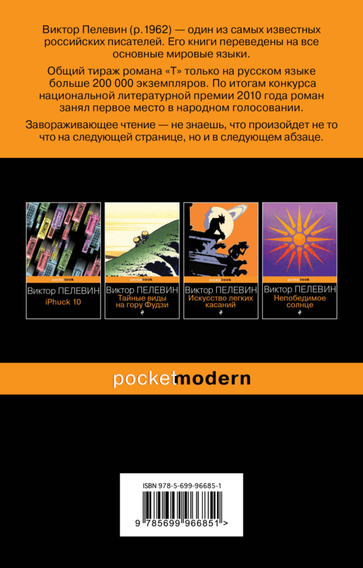Виктор Пелевин — известный российский писатель-постмодернист. Роман «Т» занял первое место на премии «Большая книга» в номинации «народное голосование». Многие произведения Пелевина переведены на другие языки и экранизированы.